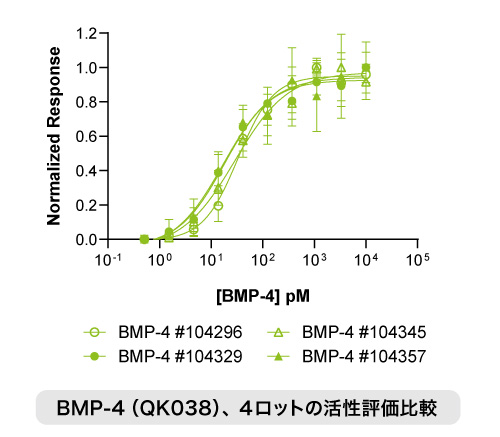 BMP-4応答性ルシフェラーゼレポーターアッセイによって、4つの異なるロットの生物活性を評価した。異なる4ロット間で生物活性が一貫している。